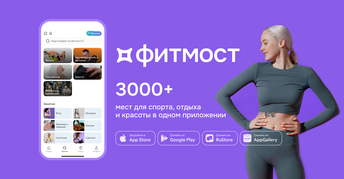 Фитмост - это приложение, в котором собрано 4000+ мест для спорта, отдыха и красоты в 80+ городах России. Все города можно посмотреть в профиле. Ещё у нас есть онлайн-занятия и заниматься можно из любой точки мира, где есть интернет. Йога, пилатес, бассейн, кроссфит, танцы, сайклинг и многое другое — экспериментируйте, пробуйте разные направления, занимайтесь в комфортном темпе и подстраивайте спорт под свой ритм жизни!