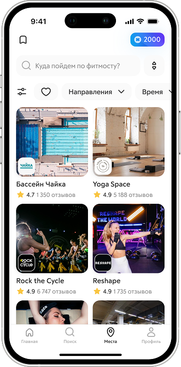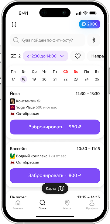Забронировать занятие или услугу можно через сайт или приложение. Перейдите в раздел «Места» или «Занятия», выберите категорию и нужные фильтры, откройте расписание студии и выберите удобное время.